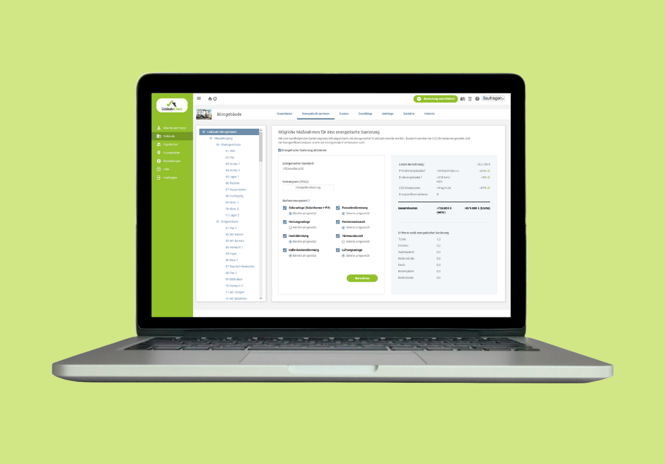 Immobilien sind große Energieverbraucher. Gesetzliche Vorgaben wie das Gebäudeenergiegesetz (GEG) oder ESG-Richtlinien erfordern strategische Modernisierungen. GebäudeCheck hilft, den Sanierungsbedarf systematisch zu erfassen und individuelle Maßnahmenpläne zu erstellen. Das neue Modul analysiert Gebäudedaten wie Gebäudehülle, Heiztechnik und Dämmwerte. Daraus berechnet die Software die aktuelle Energieklasse und zeigt Optimierungspotenziale auf. Nutzer können verschiedene Sanierungsmaßnahmen simulieren und erhalten klare Hinweise zu Kosten und Einsparungen.